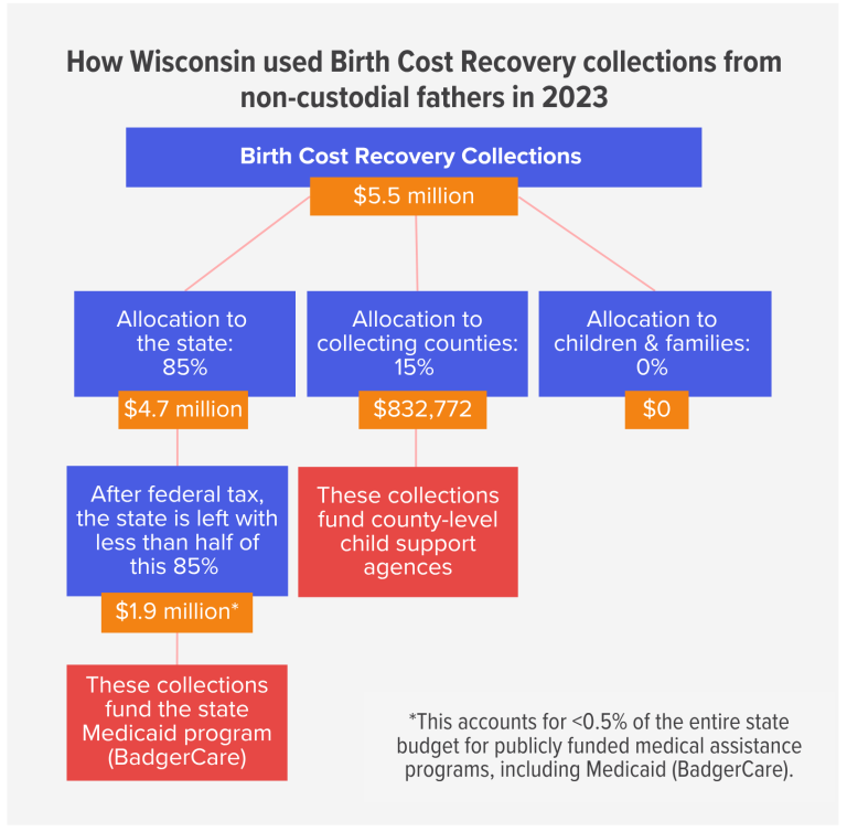In Wisconsin, county child support agencies and courts work together to determine Birth Cost Recovery debts when they establish non-custodial fathers’ child support orders. Importantly, the impacted children and mothers do not receive any of the recovered funds. The state uses the recouped funds to support the Medicaid (BadgerCare) program, and the counties use the funds to support their child support programs.